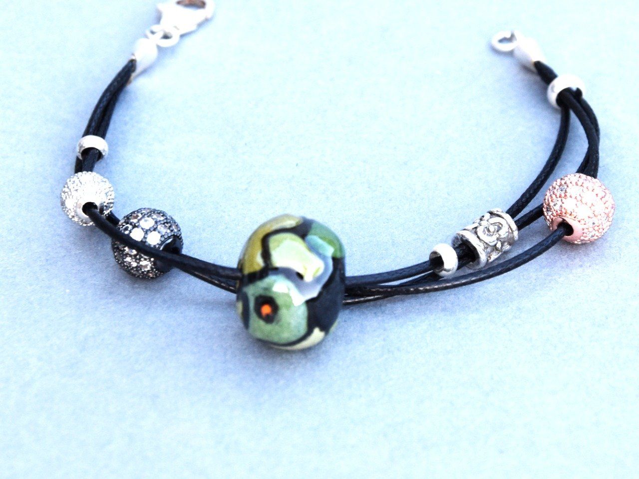 Bracelet en céramique artisanale pour femme. La perle boule est façonnée en terre émaillée, décorée dans les tons verts et montée sur un cordon en polyester noir. Elle est ensuite assemblée à deux autres cordons ornés de perles en acier inoxydable ou argent 925. La fermeture mousqueton est en argent 925. Dimensions : tour de poignet de 15 cm maximum.
