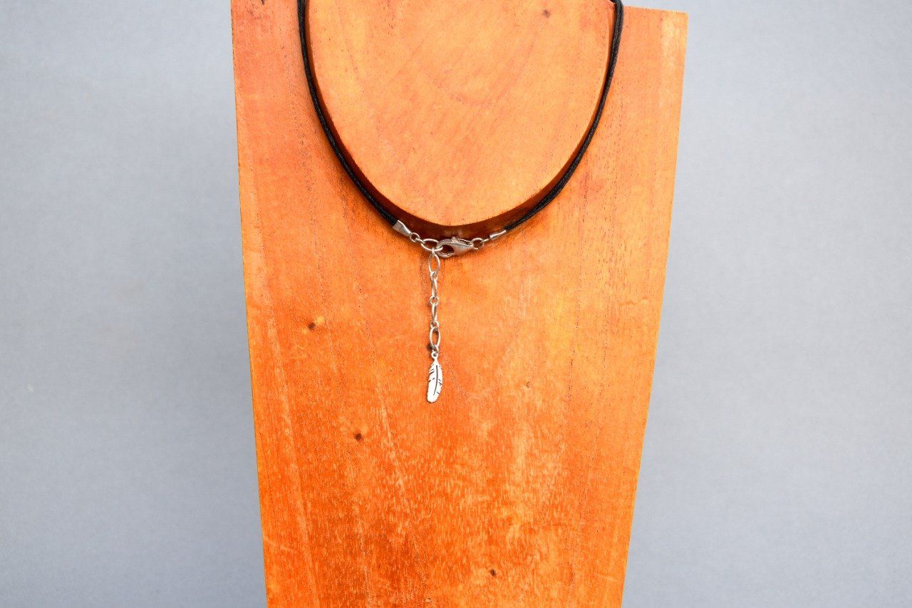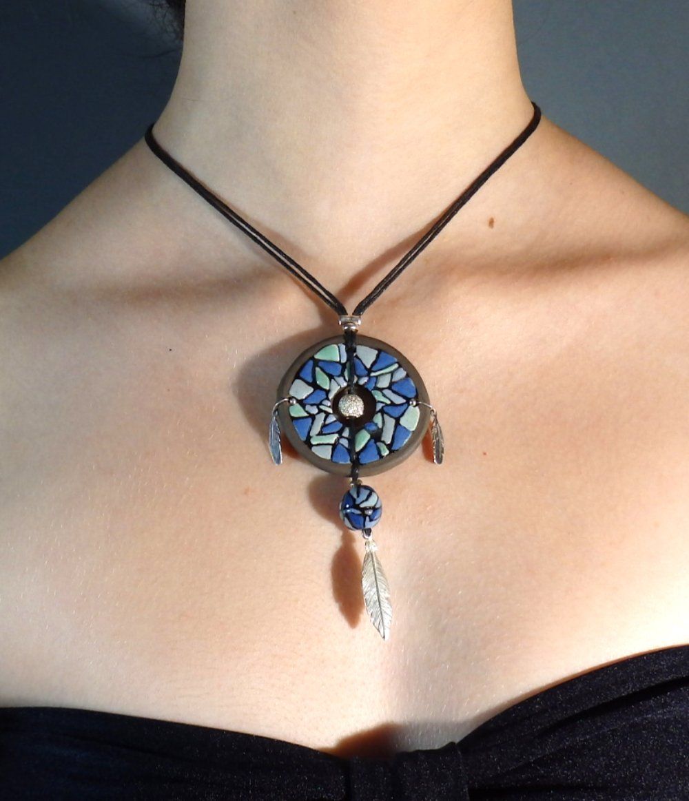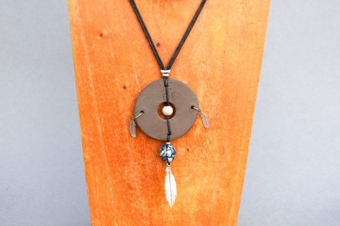 Collier réglable façon attrape-rêve en céramique artisanale pour femme. Les perles sont façonnées en terre noire, décorées dans les tons bleus et émaillées. Enfin, après cuissons, elles sont montées sur cordons en coton noir et agrémentées de breloques plumes et perles en argent 925. Fermeture mousqueton et chaînette. Toutes les parties métalliques sont en argent 925. Dimensions du tour de cou de 38 à 41 cm maximun. Pièce unique.