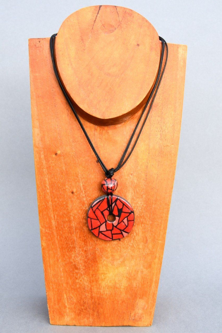 Sautoir réglable en céramique artisanale pour femme. Les perles sont façonnées en terre noire, décorées au pinceau dans les tons rouge et émaillées. Enfin, après cuissons, elles sont montées sur cordons en polyester noir. Fermeture lien coulissant. Toutes les parties métalliques sont en argent 925. Pièce unique.